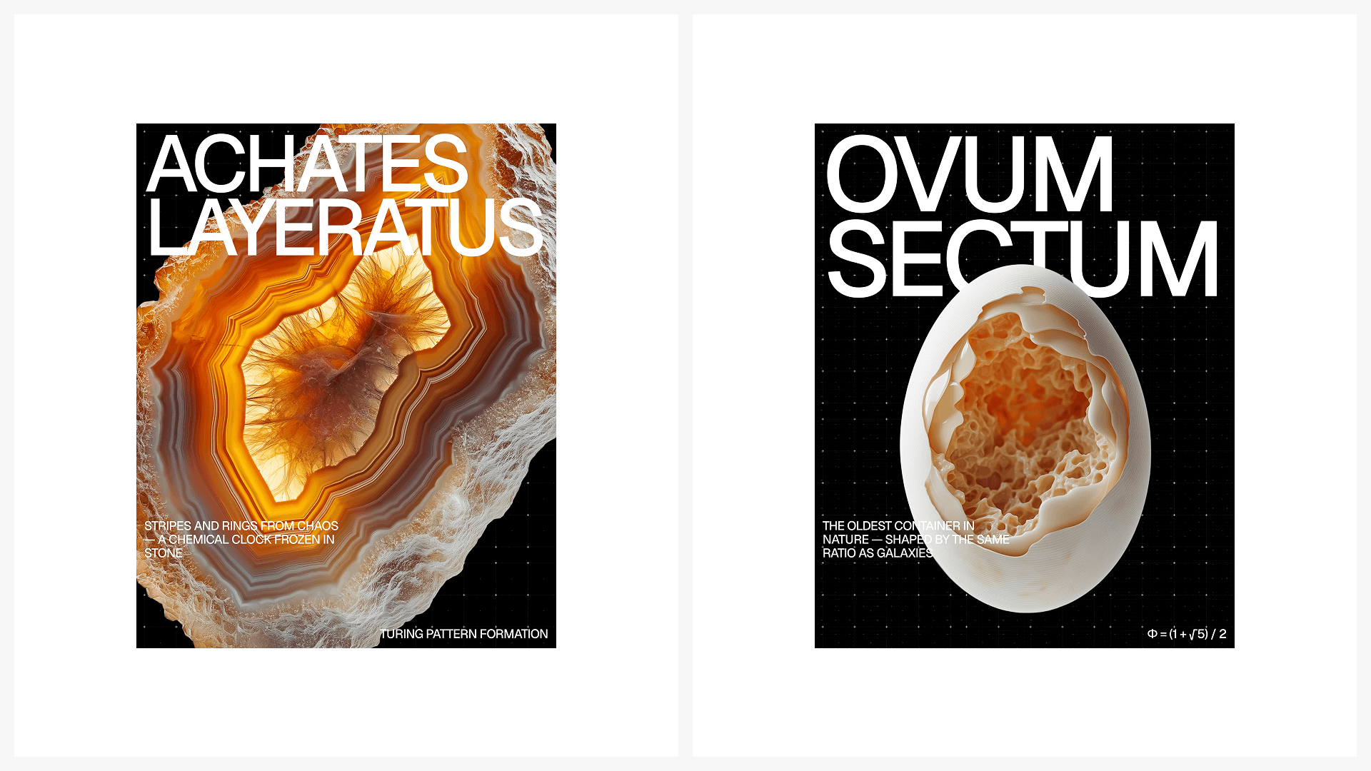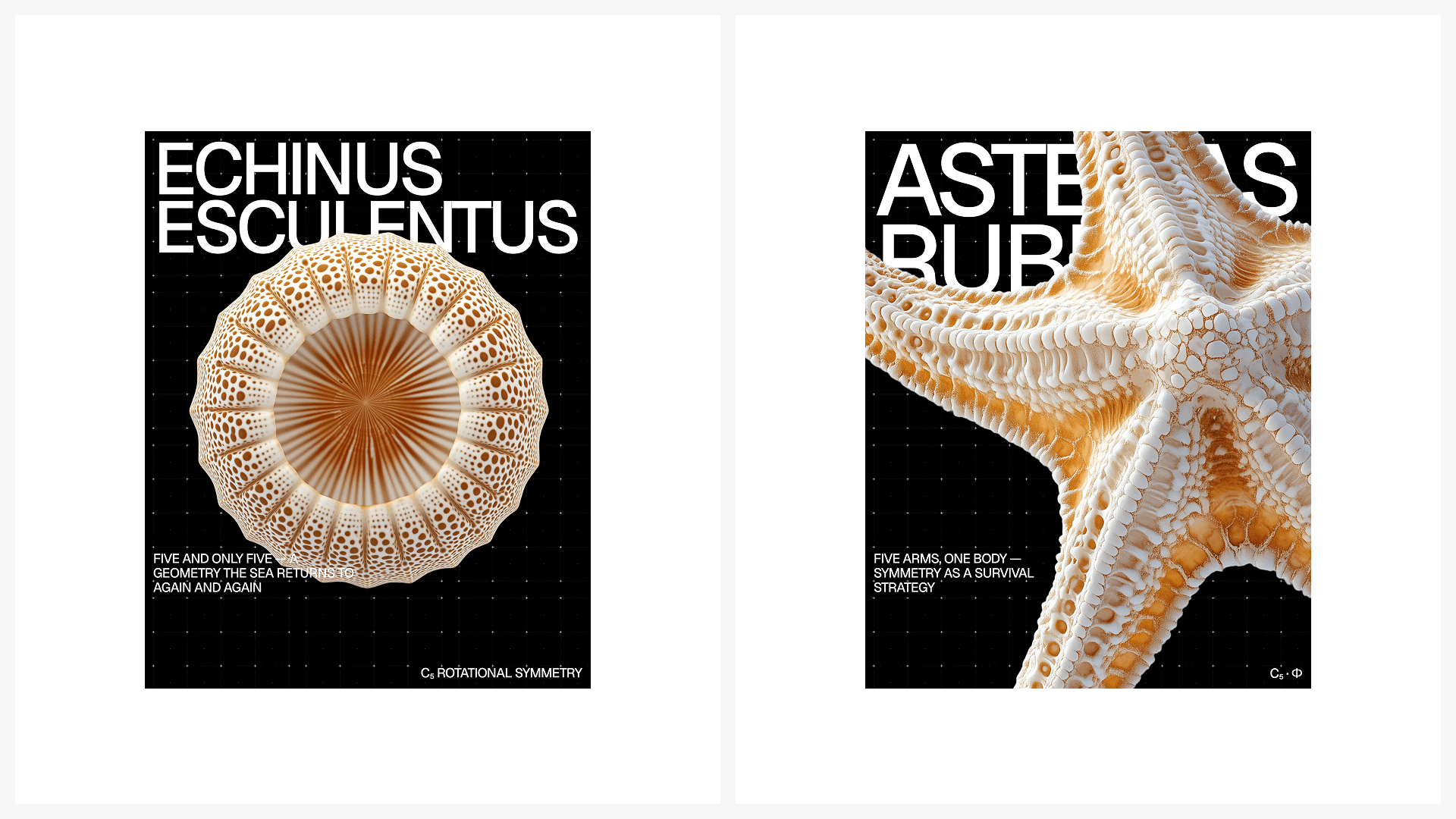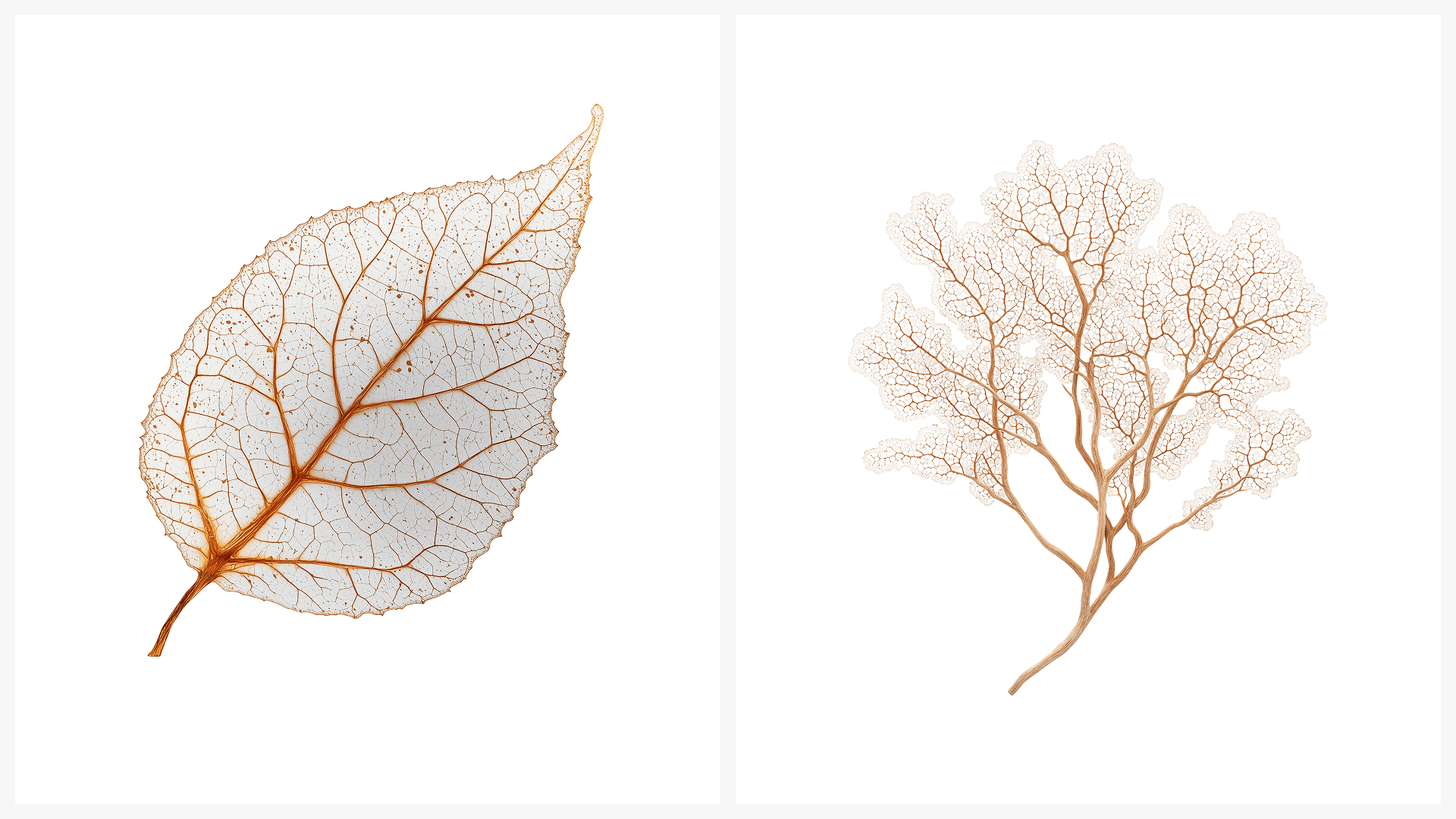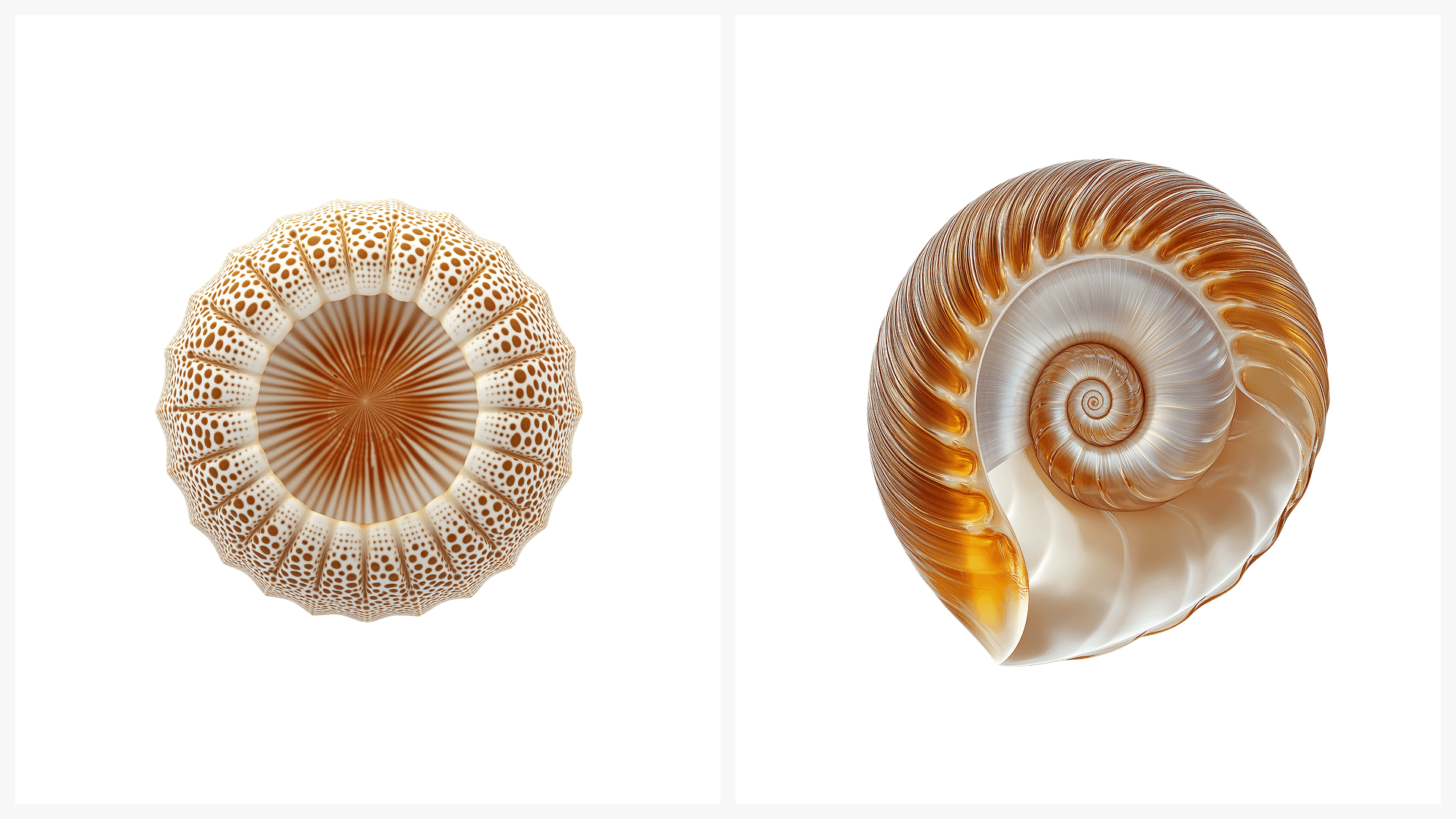 Nature hides its most precise geometry beneath the surface. A nautilus reveals a perfect logarithmic spiral. A skeletal leaf exposes its vascular network. A sea urchin shell carries five-fold symmetry. This collection makes the invisible visible.