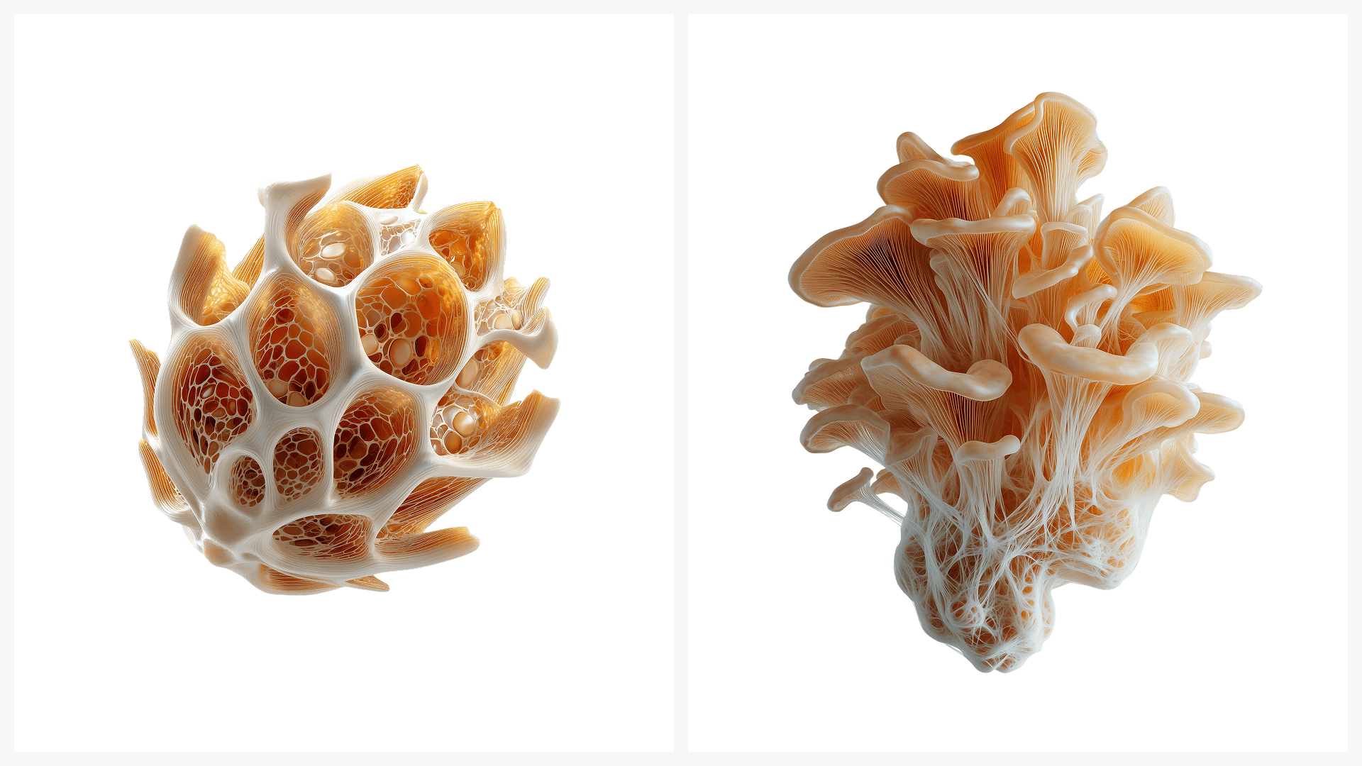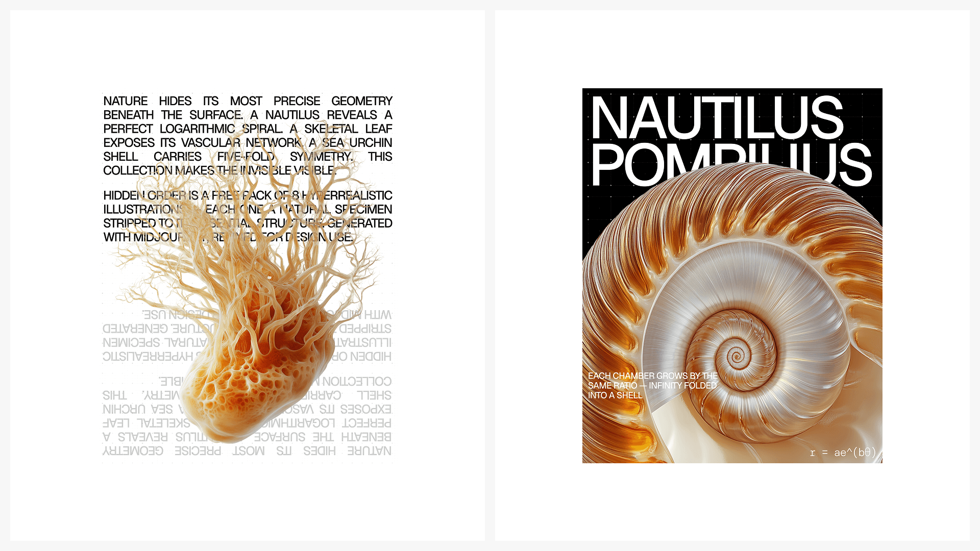 Hidden Order is a free pack of 8 hyperrealistic illustrations — each one a natural specimen stripped to its essential structure. Generated with Midjourney, refined for design use.