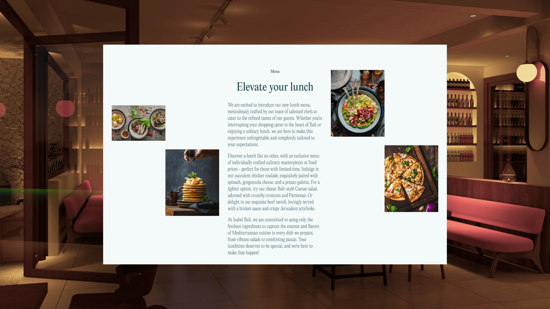 Isabel is a Mediterranean cuisine restaurant located in Bali. My task was to develop the project from the ground up, covering all aspects of branding, logo design, website creation, and market research. The entire process, from competitive analysis and surveys to design and development, was completed with the website built on Webflow.