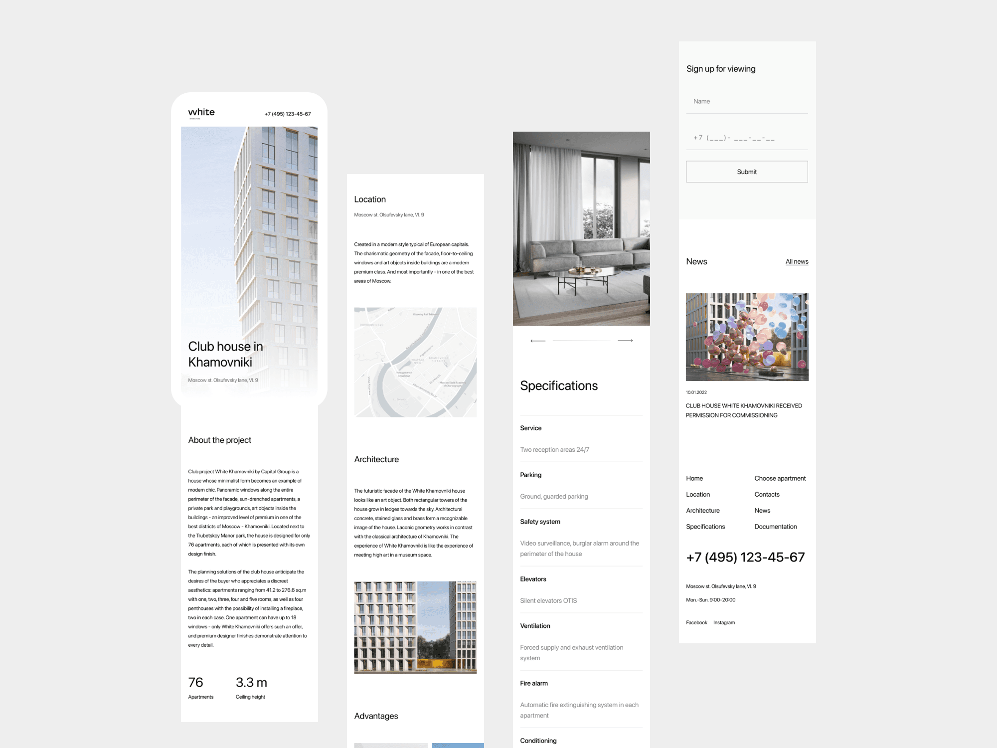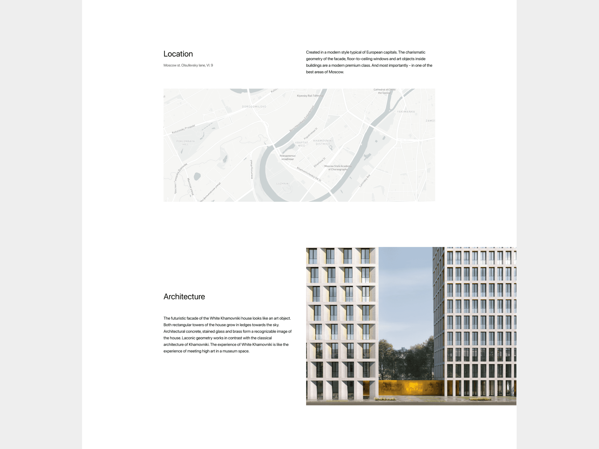 To solve the task, we developed a landing page with an elegant and minimalist design that reflects the prestige and level of the White Hamovniki project. Key elements of the solution included: